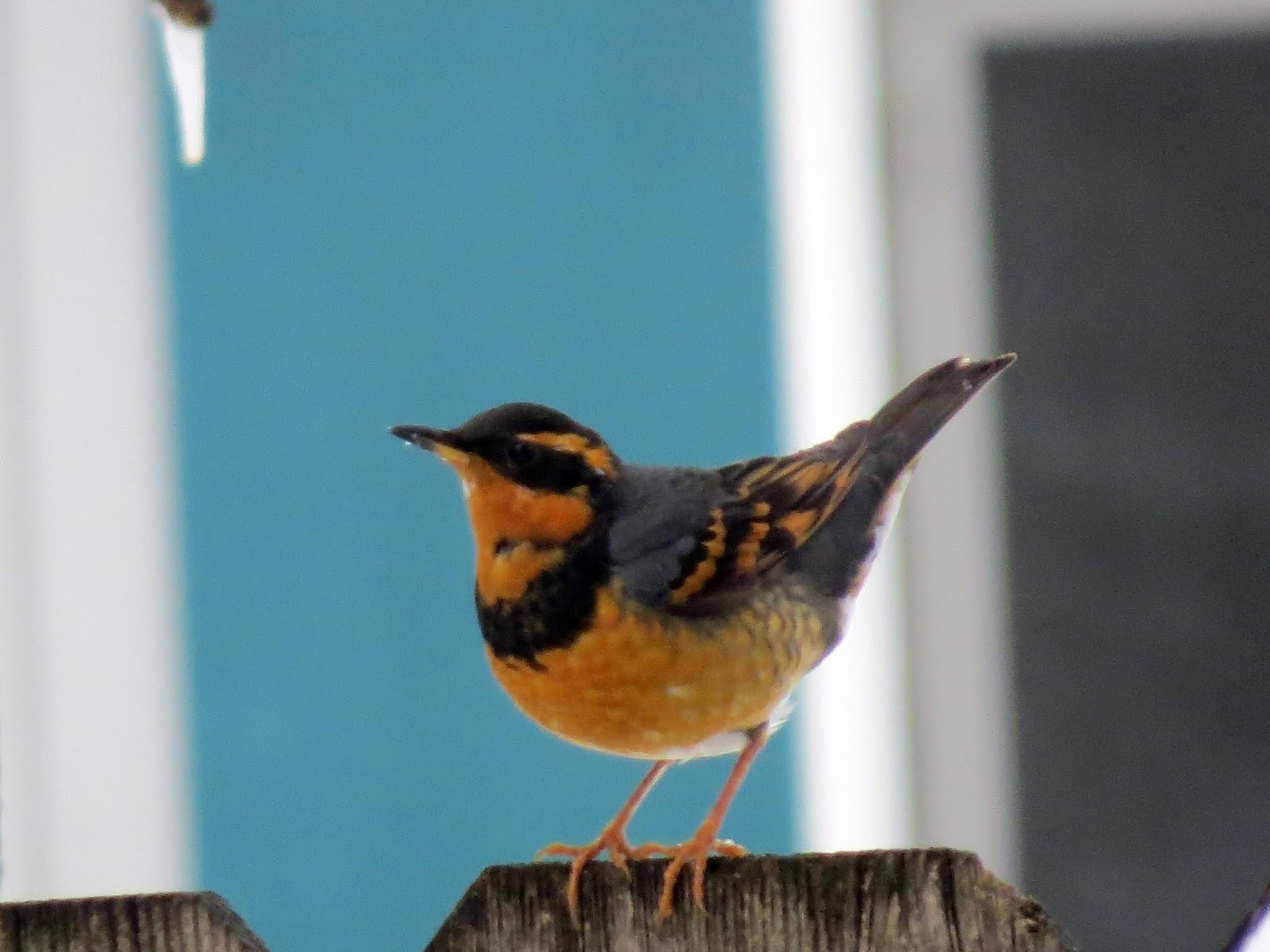 I took this photo out my back door with the digital zoom. Our neighbors across the fence have colorful shutters which made a striking backdrop to his orange and black.
